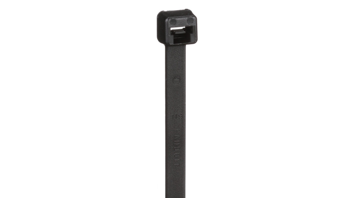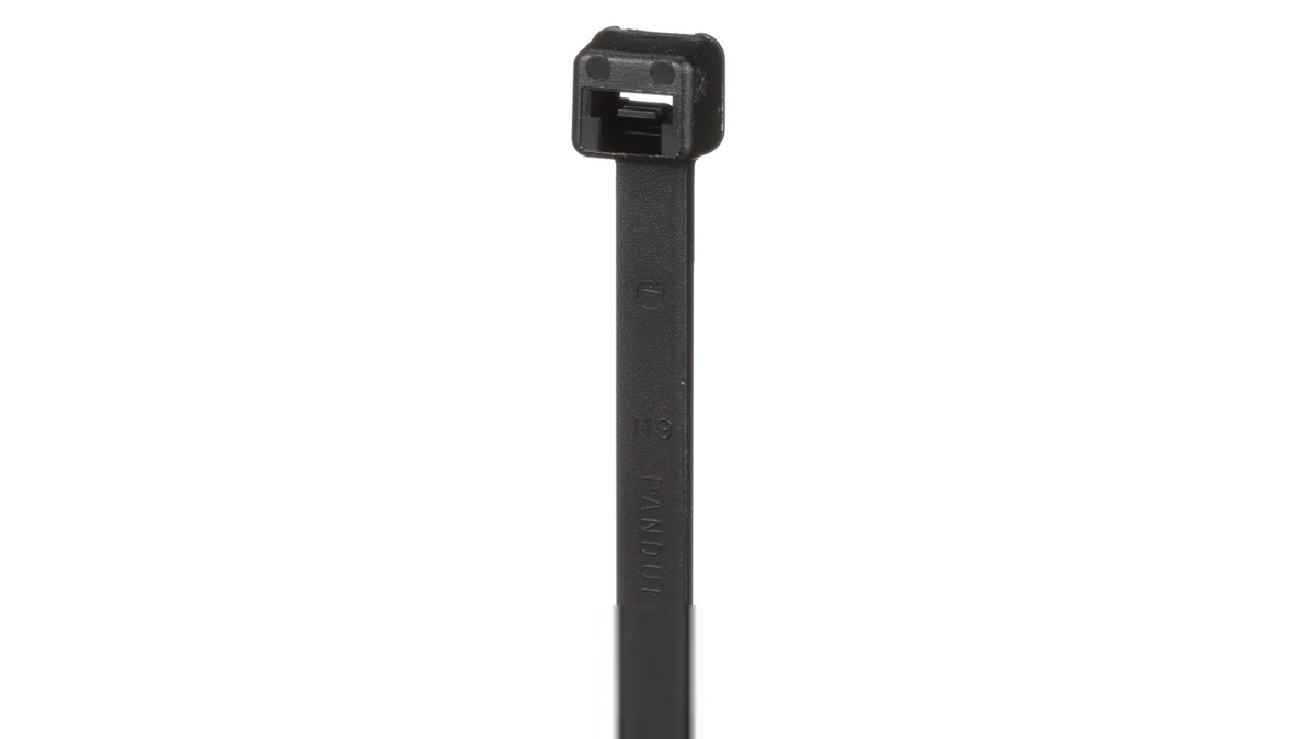 The Panduit PLT4.5S-M0 is a Pan-Ty® locking cable tie with a standard cross section and curved tip, designed for reliable bundling and securing of wires, cables, hoses, or pipes in general and outdoor applications. It features a one-piece locking mechanism for consistent performance, low insertion force, and easy threading/installation. The weather-resistant black nylon 6.6 material provides enhanced UV resistance, greater durability against environmental exposure, and suitability for higher temperature ranges (typically up to 185°F / 85°C continuous, with some sources noting heat stabilization up to 293°F short-term). Ideal for indoor/outdoor use where color-coding (black for low visibility) or weather resistance is needed. Compatible with Panduit tools like GTS-E.